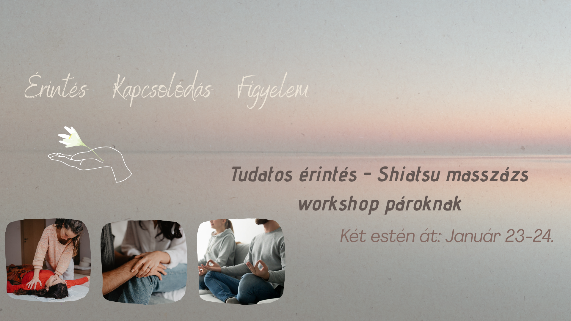 Ezen a két estén kizárva a világot egy bensőséges környezetben: egymásra hangolódhattok, lelassulhattok, figyelhettek egymás rezdüléseire: tudatos, finom, érzékeny érintések által, a Shiatsu kezelés keretein belül.